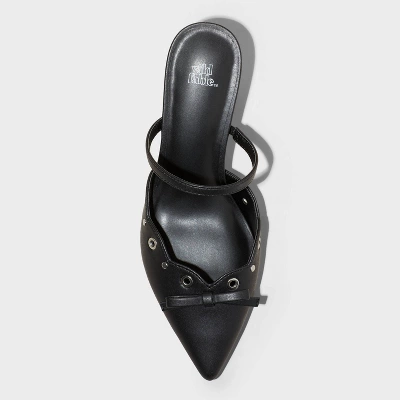 Eyelet kitten heels from Wild Fable™ with a bow-detail front. Feature a faux-leather construction with a pointed closed toe, scalloped trimming with eyelets and an instep strap. Slip-on style with a backless design completes the look, lending ease of wear.